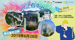 媒體新世紀2019上神州–湖南站︰小記者2.0 暑假流流長,又唔知有咩打算?參加數碼之瞳嘅交流團啦!今年會帶大家到湖南衛視,平時睇芒果台節目就多,宜家仲可以參觀內部,實在機會難得仲唔快啲報名! 日期:2019年8月8日至12日(五日四夜) 內容:拜訪當地大學與大學生交流,參觀湖南衛視,到訪張家界、阿凡達哈利路亞山… 對象:12至35歲香港居民 名額:33人 (如有需要,本會將進行面試) 費用:港幣1,250元正(另加按金:$500元) *活動完結後出席率達90%可退回按金 截止報名日期:2019年6月28日(以郵戳為準)