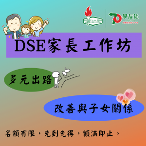 是次活動專為應屆文憑考生的家長而設,一方面透過講座讓他們了解DSE多元升學出路,另一方面透過工作坊,共同探討交流與子女溝通的有效方法,從而舒緩考生壓力。本社將於5月11日(星期六)假座香港恒生大學舉辦「DSE家長工作坊」。詳情如下: 日 期: 2019年5月11日(星期六) 時 間: 下午2:00-5:00 地 點: 香港恒生大學 利國偉教學大樓二樓演藝廳 〔沙田小瀝源行善里〕 對 象: 應屆香港中學文憑試學生家長