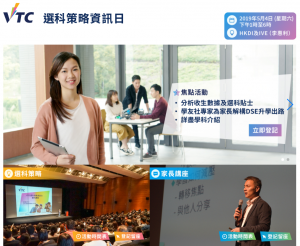 【家長與子女做好DSE 放榜準備 】 VTC將於5月4日舉辦選科策略資訊日,並邀請學友社專家吳寶城先生及陳倩雯姑娘主講「家長同行升學路」講座,與家長解構DSE升學出路及分享協助子女處理放榜壓力的貼士;同場亦會提供VTC學位、高級文憑及文憑等課程資訊,讓家長了解更多DSE考生的升學途徑及就業前景,為子女選擇合適的課程。 日期:2019年5月4日 (星期六) 時間:下午1時至6時 地點:HKDI及IVE(李惠利) 地址:將軍澳景嶺路3號 (港鐵調景嶺站A2出口)