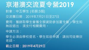 京港澳學生交流夏令營(2019) 對象:中五學生 (名額:5個) 交流團日期:2019年7月21日至27日 行程:參考附件 費用:獲錄取學生會獲全額資助參加夏令營。學生如無故退出,須支付相關費用。