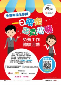 Recruit與香港零售管理協會(HKRMA) 現正舉行第二屆【Recruit x HKRMA「一日限定 店員挑機」免費工作體驗活動】,由不同品牌的「零售大使」親自教導優質零售服務,讓學生可以透過工作體驗得到相關經驗,現誠邀年滿16歲或以上學生參加。 是次活動請來4間知名機構提供1日免費工作體驗給各年輕參加者,分別為大家樂集團﹑G2000﹑蘋果迷你倉和Nail Nail。由於名額有限,有興趣參加的學生須填寫參加表格及於5月中進行一項面試,表現優異之學生將可參加這次工作體驗活動,到工作實地了解企業運作流程,學習專業人際溝通、說話用語等技巧,及如何有效解決顧客疑難。所有完成工作體驗之學生可獲由主辦機構Recruit 和香港零售管理協會(HKRMA)發出之活動出席證書乙張,及獲贈餐飲禮券。 報名流程 報名日期:2019年4月30日 或之前 遴選及面試:2019年5月 體驗日:2019年