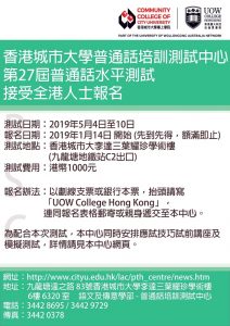 2019年1月14日 第二十七屆普通話水平測試開始接受報名。先到先得,額滿即止。 詳情請見海報 及 報名手續。 試前講座及模擬測試亦開始接受報名。詳情請見海報及報名手續。
