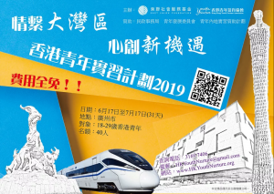 計劃詳情 日期:2019年6月17日至7月17日(31天) 地點:大灣區 廣州市 對象:本港18-29歲香港青年 名額:40人(所有參加者須參與視像面試) 費用:團費全免*+按金港幣800元** *包括香港往返廣州高鐵票、當地住宿、膳食(午餐及自由活動的膳食須自理)、當地交通津貼、數據卡、綜合旅遊保險(只含基本保障)及大會指定參訪活動等費用 **$800按金須於確認參與資格後繳交 (參加者依時出席啟程前訓練營、啟程前簡介會暨專題講座、總結分享會;按時提交實習中期及總結報告、小組微電影;在內地實習期間,準時上班、準時出席大會安排之非工作日參訪活動,以及表現良好,方可於總結分享會退回按金) 啟程前及回港後活動