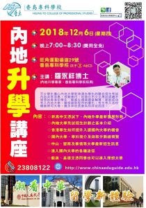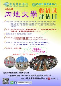 香島專科學校將於2018年12月6日(星期四)舉辦內地升學講座。 如欲查詢或留座,請致電 23808122與機構職員聯絡 或瀏覽網站: 另,【內地大學聯招試評估日2018】將於12月15日(星期六)舉行,如欲查詢或報名,請致電 23808122與機構職員聯絡或 瀏覽網站 http://www.chinaeduguide.edu.hk/event-E00675.html 電話﹕2381
