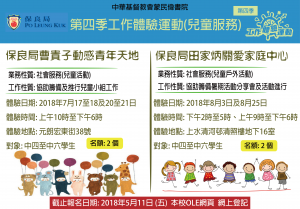 保良局曹貴子動感青年天地 業務性質: 社會服務(兒童活動) 工作性質: 協助籌備及推行兒童小組工作 體驗日期: 2018年7月17至18及20至21日(四天) 體驗時間: 上午10時至下午6時 體驗地點: