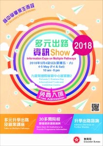 教育局將於二O一八年五月四日和五日在九龍灣國際展貿中心舉辦「多元出路資訊SHOW 2018」,為中學畢業生提供不同出路的資訊,在規劃升學途徑及就業出路作好準備。免費入場。 日期: 2018年5月4日及5日 (星期五及星期六) 時間: 上午10時至下午6時 地點: 九龍九龍灣展貿徑一號九龍灣國際展貿中心二號展貿廳 主辦單位: