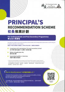 香港演藝學院於去年正式推行「校長推薦計劃」,鼓勵在戲曲、舞蹈、戲劇、電影電視、音樂或舞台及製作藝術具天賦的中學生,由校長推薦報讀演藝學院的學士學位及大專課程。凡於教育局註冊的本地中學、英基學校協會轄下中學及私立國際中學就讀的應屆考生,皆有機會透過此計劃,報讀演藝學院。 香港演藝學院學士學位及大專課程於每年秋季開始接受報名。誠願藉此計劃,讓更多年輕人踏上演藝之路。 Encourage secondary school students with distinguished achievements in