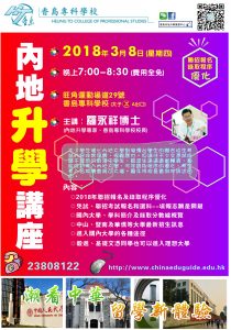 日期: 2018年3月8日(星期四) 時間: 晚上7:00-8:30 地點: 九龍旺角運動場道29號 (太子港鐵站A出口) 香島專科學校 不少學生擔心內地大學對港澳台學生的聯合招生考試內容非常深奧,很難應付。但過往不少文憑試成績不理想的香港中學生、毅進生通過一年準備,都能成功考入內地大學,原因何在?羅永祥校長會為你詳述因由。 內容:
