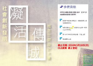 踏入第五屆「社會創新發明比賽」,世界綠色組織期望透過是次活動鼓勵參賽者運用「生活」和「傳承」的概念,設計特式主題的共享生活或工作空間,「凝聚」不同背景、年齡及階層的人士。藉著是次比賽,我們期望吸引更多相同理念的人分享他們的生活、智慧、經驗及技術,促進人際間的交流,並推動創意及將「綠色」元素融入設計,引發年輕一代關注社會和環境議題,共同推動社會的可持續發展。 目的: 提升年輕人對社會及環境問題的關注 讓年青人發揮創意,透過設計以促進人際間的交流機會,促進城市的文化交流及發展 將「綠色」的概念融入生活,推動社會的可持續發展 相關網頁: http://thewgo.org/website/chi/inventor2017-2018-intro/ 參賽資格: 中學生(由中一至中六同學) 每隊成員為2-3人,隊員可來自同一所學校或不同學校 同一所中學可派多隊參賽,不設上限