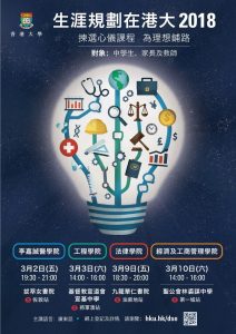 為幫助文憑試學生及早作生涯規劃,香港大學將於 2018 年 3 月2、3、9、10日分別在四所中學舉辦《生涯規劃在港大》本科課程及入學講座。屆時香港大學李嘉誠醫學院、工程學院、法律學院及經濟及工商管理學院的教授將聯同香港大學的招生主任、學院畢業生及學生大使分享最新行業概況、就業前景,以及港大如何培養學生成為行業精英,以便學生為升學、就業及生涯規劃作更好準備。 歡迎中學生、老師、家長及有興趣人士出席。 Dates: March 2 (Fri), March 3