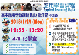 應用學習旨在讓學生從應用及實踐中學習基礎 的理論和概念,培養他們促進未來升學及就業 的入門技能和共通能力,以幫助學生探索及了 解就業及終身學習的路向。 共六個學習範疇: 高中應用學習課程(ApL)簡介會 對象: 中四級同學 日期: 2018年1月29日(一)