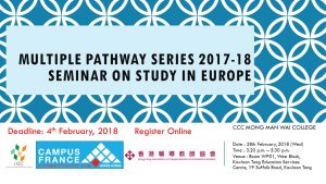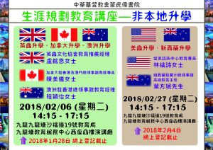 生涯規劃教育講座──非本地升學(英國、加拿大及澳洲) 本講座旨在透過邀請經驗豐富的非本地升學諮詢機構代表到場講解和曾在英國、加拿大及澳洲當地就讀的學生的經驗分享,讓參加者能夠掌握全面及最新的英國、加拿大及澳洲升學資訊。講座內容包括申請入學及學生簽證的手續、入學考試/測驗、財務安排、心理準備及外地學習生活的適應等。 日期: 2018/02/06 (星期二) 時間: 14:15 – 17:15 地點: