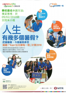 「”Train”出光輝每一程」計劃每年暑假期間為高中生提供獨特的學習旅程,提升個人知識和技能,以積極準備迎接未來的挑戰。計劃自推出以來,參與的學生均認為他們能在領導才能、創意、主動學習、溝通技巧、人際關係、以及團隊精神等範疇上有所進步。 學生們會在活動初期進行職業興趣測試,讓他們更加瞭解自己的興趣和專長,並在各種職業導向活動中吸取更多知識。 > 連續三天的體驗營 > 多元化的工作坊 >「生涯規劃」模擬遊戲 > 參觀港鐵公司及實習體驗 > 培訓日程表 詳情參閱計劃簡介 對象:中三至中五 經學校提名者將獲優先考慮。(名額5個)