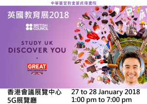 英國教育展雲集超過100間英國院校,包括中小學、延續教育學院及大學參展。院校代表更會即場為學生及家長提供大學、專上學院及中小學課程的第一手升學資訊。展覽期間設有多場實用升學工作坊及講座,主題涵蓋英國的文化及生活習慣、UCAS申請程序及IELTS備試策略等,協助學生及家長作出明智的升學選擇! 香港會議展覽中心 灣仔港灣道1號香港會議展覽中心5G展覽廳 27 to 28 January 2018 1:00