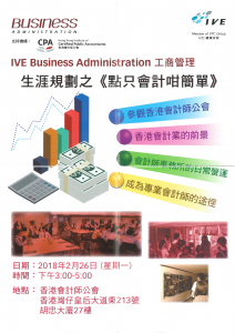 《點只會計咁簡單》工作坊內容包括參觀香港會計師公會,並透過簡介、分享、短片及問答遊戲等活動,讓同學加深認識會計業的前景,成為專業會計師的途徑及會計師事務所的日常運作。 日期: 2018年2月26日(一) 時間: 下午3:00 – 5:00 地點: 香港會計師公會(香港灣仔皇后大道東213號胡忠大廈27樓 對象: