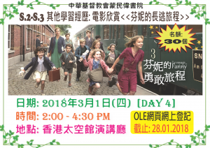 二戰時期,芬妮和兩個妹妹像其他猶太孩童一樣,被送到收容中心避難。當納粹德軍進駐意大利,她被委以重任,帶領孩童逃往不受戰火影響的中立國瑞士去。芬妮從恐懼、抗拒到鼓起勇氣,克服旅程中的困難險阻,完成不可能的任務,充分體現戰火無情,人間有愛。 《芬妮的長逃旅程》 日期: 2018年3月1日(四) [Day 4] 時間: 2:00 – 4:30