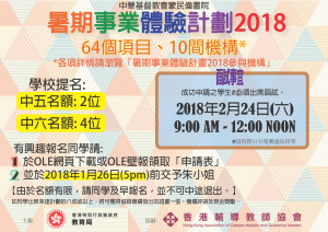 由 1976年開始,教育局每均與香港輔導教師協會合辦的暑期工作體驗計劃,安排中五及中六的學生在暑假期間到不同的工商機構體驗數星期, 了解各行業的運作,明瞭工作所需的能力、態度和其他要求,令同學們在踏入工作世界前能好好裝備自己。 機構及項目詳情: 暑期事業體驗計畫2018參與機構 申請表: 暑期事業體驗計畫2018申請表(S5) 暑期事業體驗計畫2018申請表(S6)