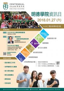 明德學院致力推廣博雅教育,以專博並重的教學模式,培育有能力面對挑戰,跨越未來的新生代。為讓更多學生體驗博雅教育的優點,明德學院於2018-19學年特設全新獎學金及學費減免計劃,最高可享4年學費全免。 誠邀你蒞臨於1月27日舉行的明德學院資訊日,親身體驗博雅教育、小班教學的學習氛圍,與教授及同學打成一片。重點節目如下: 專題講座:「博雅教育─創造理想就業前景」 (詳情) 專題講座:「HKDSE古文講座」(詳情) 遊戲活動 (詳情) 2017-18學年 4年制獎學金及學費減免介紹 (詳情)