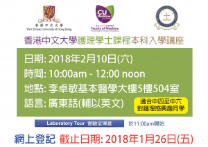 按此網上登記 截止日期: 2018年1月26日(五) 瀏覽相關網頁: http://www.nur.cuhk.edu.hk/b5/education/undergraduate-studies/bachelor-of-nursing 課程簡介 此課程旨在培育學生成為香港護士管理局的普通科註冊護士,在現時高科技及多元化的醫療體系中,為病人提供優質護理,促進公眾健康。本課程的主要範圍涵蓋生物及行為科學、健康維持與促進、護理實務和理論、護理科研及資訊科技。學生亦可透過到社區及醫院實習,汲取照顧病人的經驗。 修讀模式 全日制:五年 學生可因應過往獲取的資歷,申請具認可學歷入讀本課程。