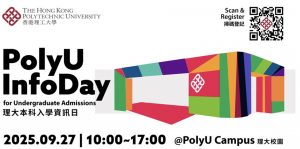 理大本科課程資訊日 日期:2025年9月27日(星期六) 時間:10:00 – 17:00 地點:理大校園 活動詳情:https://www.polyu.edu.hk/study/events/ 報名方法(請參加的同學提前報名):掃描QR code 或到