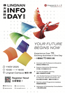 嶺大資訊日 日期:1.11.2025 時間:10:00 – 18:00 (入學講座於早上10時45分開始) 地點:嶺南大學校園 活動詳情:https://www.ln.edu.hk/admissions/ug/tc/event/info-day2025 報名方法(請參加的同學提早報名):掃描QR code