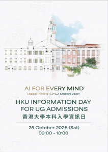 香港大學本科入學資訊日 日期:25.10.2025(星期六) 時間:09:00 – 18:00 地點:香港大學校園 活動詳情:https://www.infoday.hku.hk/ 報名方法(請參加的同學提早報名):https://hku.au1.qualtrics.com/jfe/form/SV_eRsXGNcBYqgmPOe 部分活動需要個別登記,詳情請瀏覽資訊日網頁。