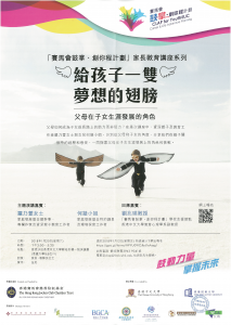 「賽馬會鼓掌‧創你程計劃」家長教育講座系列 主題:「給孩子一雙夢想的翅膀」 – 父母在子女生涯發展的角色 父母如何成為子女成長路上的助力而非阻力?在是次講座中,資深親子及教育工作者羅乃萱女士與女兒何凝小姐,分別從父母和子女的角度,分享她們在親子關係中的經歷和感受,一同探索父母在子女生涯發展上的角色和挑戰。 日期 : 2018 年 1