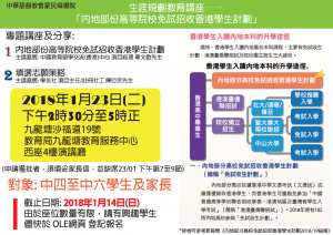 專題講座及分享: 1. 內地部份高等院校免試招收香港學生計劃 主講嘉賓: 中國教育留學交流(香港)中心 頂目經理 章文歡先生 2. 填選志願策略 主講嘉賓: