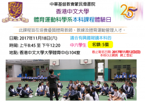 為了讓中六學生更了解該課程的特色,該系擬定於本年度舉行兩次「本科課程體驗日」。 第一次「體育運動科學系本科課程- 體驗日」詳情如下 : 日期 地點 時間 內容 18/11/2017 (星期六)