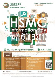 日期:2017年11月18日(星期六) 時間:上午9時30分至下午5時正 地點:恒生管理學院(沙田小瀝源行善里) (一) 專題講座 主題: 大學選科攻略 講者: 香港輔導教師協會副主席何玉芬博士 對象: