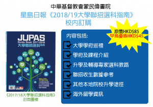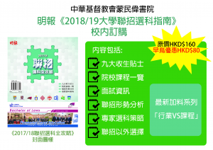 《明報》為幫助學生明智部署升學計劃,連續十多年出版《聯招選科全攻略》,蒐集最新及第一手準確的院校資料。全書劃分實用資料、院校巡禮、收生成績、課程概覽四部分,囊括九大院校聯招課程及收生成績。同學一書在手,即可掌握實用而全面的聯招資訊,仔細策劃升學路向。 《2018/19聯招選科攻略》內容包括: 九大院校專訪﹕院校收生組代表講解收生要求,學生代表分享院校特色、校園生活 詳盡課程概覽﹕詳列各聯招課程去年收生成績、面試資料、入學要求等 改選策略建議﹕過來人分享改選策略,並由升學專家分析成敗關鍵 聯招形勢分析﹕分析聯招收生形勢、20個志願排序方法 截止日期: 2017年9月24日(日) 網上登記 **完成訂購登記的同學須於2017年9月26日(星期二)或之前向朱小姐繳交HKD$80訂書費用。**