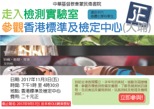 日期:二零一七年十一月三日(星期五) 對象:中六修讀化學科學生 集合時間:下午一時 集合地點:本校陰雨操場 學生衣著:整齊校服 交通:旅遊車 (只提供去程,由學校至檢測實驗室) 費用:20元正 名額:20個 解散時間:下午四時三十分