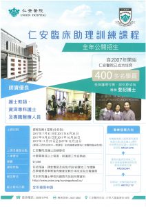 臨床助理訓練課程 簡介 鑑於護理專業人才需求甚殷,仁安醫院於2010年開設臨床助理訓練課程培育有志人士加入護理工作,至今此課程已開辨了十數屆並成功培訓及聘用超過數百名學員投身護理行業。 課程內容 內容﹕ 基礎人體生理學 常見疾病介紹 常見藥物認識 常見的檢查及化驗 基礎臨床護理技巧