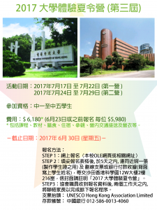香港聯合國教科文組織協會 分別與 香港中文大學 (GLBS)與香港理工大學 (ISE) 合辦 「2017大學體驗夏令營」,旨在讓青少年親身體驗大學生活及學習模式,通過多元化專題項目以學習新知、提升演說能力及培養團隊精神,為全人發展奠下良好基礎。 活動日期: 2017年7月17日 至