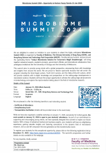 微生態峰會是一次享有盛譽的國際聚會,匯集了微生態研究領域的學術專家與意見領袖。而微生態峰會作為一個匯聚各方的平台,冀望於為社會及世界帶來一個進行富有洞察力的討論,並分享突破性研究成果以及促進學術界、工業界和其他主要利益相關者之間合作。 而是次微生態峰會2024 ,再次由香港中文大學醫學院、香港微生物菌群創新中心(MagIC),以及香港科技園公司合辦,並會在2024年01月12日(星期五)於香港科學園舉行。而是次峰會會圍繞著「Today’s Microbiome Solution for Tommorrow’s MagIC Breakthrough」進行。而有關峰會的活動詳情如下: 日期: