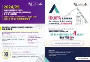 HKAPA入學及傑出獎學金 香港演藝學院入學及傑出獎學金旨在鼓勵於面試表現卓越及學術成績優秀的本地生入讀香港演藝學院學士課程,並提供最高可達四年的獎學金(獎學金金額等同學士課程之全年學費)。 参加資格: 在頒發獎學金的年度就讀演藝學院全日制學士課程一年級之本地生,並由演藝學院各院長推薦。 詳情可電郵至 sao@hkapa.edu.hk 查詢 校長推薦計劃(學士及大專課程) 各中學校長可推薦在表演藝術上有傑出表現的同學,報讀香港演藝學院。各中學可提名最多六位學生*參與計劃,並且報名費會豁免,以及保證可獲安排面試。
