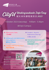 2023 年城大本科生資訊日將於 2023 年 10 月 7 日(星期六)舉行,並主要會介紹理學院的相關資訊。 而透過課程/入學講座、學生/校友分享、實驗室參觀等一系列活動,同學可以在探索未來學習和職業道路的同時發現科學的樂趣。 查詢方法:
