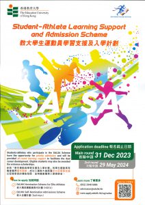 香港教育大學作為「精英運動員友好大學」的先驅,致力為精英運動員提供全方位的關懷和支援,鼓勵運動員持續進修,作雙軌發展。2010年至今,教大已錄取近130名精英運動員入讀本校的不同課程。於2022年,大學教育資助委員會(教資會)推出了「學生運動員學習支援及入學計劃 」(SALSA),目的為進一步促進對香港傑出學生運動員入讀大學及其學習上的支援,作雙軌發展。此計劃更提升了教大對學生運動員的支援並開拓了特別收生渠道。 現時,參與「學生運動員學習支援及入學計劃」的學生運動員有機會獲得優先取錄,成功入讀教大後將獲全方位學習支援以促進學員的雙軌發展,並有機會獲得入學獎學金。 報名方法 教大精英運動員提名計劃(NSEA) 教大自薦計劃(Self-Nom) 報名截止日期: 31/12/2023 (首輪申請)