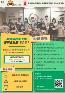 聖雅各福群會於2021-2022學年獲龐陳燭餘教育基金及香港公益金委任籌辦「教育及社會工作獎學金計劃2021」,目的是獎勵本港中學文憑試成績優異及即將在2021/22年度修讀本地註冊全日制教育或社會工作學士學位課程一年級的貧困學生。成功得獎的 15位學生 每人可獲發放一筆過 港幣16, 000元獎學金。 符合以下資格的同學可以申請: 一、 成功獲得本港大學取錄為 2021-2022 學年註冊全日制教育或社會工作學士學位課程的