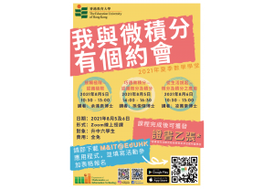2021年夏季數學學堂 – 我與微積分有個約會 今年夏天,與微積分來個約會吧! 香港教育大學數學與資訊科技學系今夏將舉辦『我與微積分有個約會』夏季數學學堂。活動由生活及數學角度探討分析極限、微分及積分的概念和應用。 課程一共3節,每節課均由香港教育大學資深數學教授主講,由淺入深、循序漸進的為參加者講解極限及微積分的奧秘。歡迎各升中六學生 (即2021/22年度就讀中六的學生)
