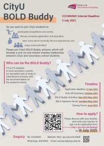 香港律師會於2009年開始每年舉辦「法律先鋒」師友計劃,由律師、見習律師及法律系學生擔任導師角色,透過各種法律活動,與中學生交流,言傳身教。 新一期的「法律先鋒」師友計劃將以全新體驗方式登場。第十二期師友計劃秉承「薪火相傳」的理念,將兼備線上線下活動,促進導師與同學之間的互動,從中給予適當的指導,啟發同學們積極正面的人生觀。第十二期「法律先鋒」師友計劃現正招募學生。 第十二期活動訂於今年9月展開,大會訂於11月13日舉辦第十二期「法律先鋒」師友計劃日間領袖培訓訓練營(*香港律師會將會因應疫情發展適時作出相應安排或調動)。此外,大會將定期安排各種網上活動,希望透過多元化的活動,增加師友之間的交流,讓學生從中汲取各類型的法律知識。 對象:中四至中五學生 下載:報名表格 有興趣學生請填妥報名表格,於2021年7月2日前親身遞交至本校教員室(051)鍾淑婷老師 或 (061)朱芷慧小姐。