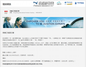 飛機工程夏日營 航空學院一年一度的暑期活動,為16歲或以上的青年帶來又充實又有趣的「飛」一般學習之旅。學員不但學習到航空業基礎知識,更會走訪機場多個地方,加上資深從業員的分享,「飛」常精采! 為期五天的飛機工程夏日營,與香港青年航空學會(HKYAA)合作,透過一系列的專家分享、實地參觀(如香港國際機場飛行區和維修區)及VR虛擬實境示範,喚起學員對飛機維修工程的興趣。學員將對飛機工程有基本的認知,並了解飛機工程、航空運輸及航空交通管制在日常運作中的相互關係。 對象: 16歲或以上青年 截止日期: 2021年6月26日(名額有限,先到先得) 申請者選用信用卡付款可加快確認取錄及處理訪客通行證之申請。 1525 –