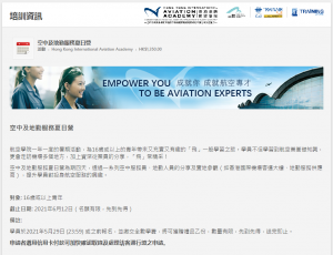 空中及地勤服務夏日營 航空學院一年一度的暑期活動,為16歲或以上的青年帶來又充實又有趣的「飛」一般學習之旅。學員不但學習到航空業基礎知識,更會走訪機場多個地方,加上資深從業員的分享,「飛」常精采! 空中及地勤服務夏日營為期四天,透過一系列空中服務員、地勤人員的分享及實地參觀(如香港國際機場客運大樓、地勤服務供應商),提升學員對投身航空服務的興趣。 對象: 16歲或以上青年 截止日期: 2021年6月12日(名額有限,先到先得) 申請者選用信用卡付款可加快確認取錄及處理訪客通行證之申請。 1529
