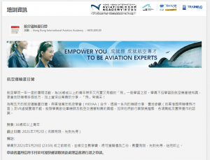 航空運輸夏日營 航空學院一年一度的暑期活動,為16歲或以上的青年帶來又充實又有趣的「飛」一般學習之旅。學員不但學習到航空業基礎知識,更會走訪機場多個地方,加上資深從業員的分享,「飛」常精采! 為期五天的航空運輸夏日營,與香港青年航空學會(HKYAA)合作,透過一系列的機師分享、實地參觀(如香港國際機場飛行區)及VR虛擬實境示範,啟發學員對從事機師及航空交通管制員的興趣,加深他們對行業發展趨勢、各項職能及實際運作的認識。 對象: 16歲或以上青年 截止日期: 2021年7月2日(名額有限,先到先得) 申請者選用信用卡付款可加快確認取錄及處理訪客通行證之申請。 1522 –