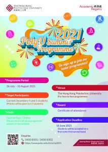 Official website: https://www.polyu.edu.hk/ar/web/en/for-applicants/ssr/summer-programme/summer-programme-2021/index.html For enrollment, please click here. All face-to-face programmes