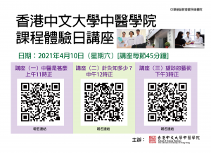 香港中文大學中醫學院自1998年成立至今開辦了中醫學學士學位課程,辦學宗旨包括(一)栽培既能諳熟中醫理論與臨床運作、有現代醫學知識之的高水平中醫師;(二) 為香港培育一批有學養、有醫德、有使命感的中醫人才及(三) 以承擔中醫藥持續發展之重任。此課程至今已培育出逾千名中醫畢業生,為香港中醫藥事業持續發展出一分力。學院亦分別在醫、教、研三方面建立穩建基礎,並透過學界、業界及社會各方共同協作下,攜手推動中醫藥進一步發展。 中醫學院每年均會參與由香港中文大學舉辦的課程體驗日,讓高中生﹑老師及家長體驗中醫及增加體會。唯今年受新冠肺炎疫情的影響,本年度的課程體驗日將會改以網上形式進行。 是次活動只限預先登記人士參與,而且講座名額有限,鼓勵盡快登記參與,以免錯過難得的體驗機會。 日期 2021年4月10日(星期六) 內容 講座每節45分鐘,包括 講座(一)– 中醫是甚麼 講座(二)– 針灸知多少?