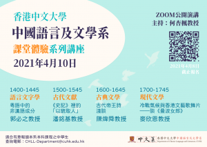 為方便中學生安排升學計劃,本系推出「香港中文大學中國語言及文學系課堂體驗系列講座」,邀請本系四位教授通過網上授課,分別選講語言文字學、古典文獻、古代文學、現代文學的課題,並設問答互動環節,解答疑難,讓有意報讀本系的學生體驗大學學習模式,了解本系特色,開闊視野,增廣見聞。詳情如下: 日期:2021年4月10日(星期六) 時間:下午2時至6時(共分為四節) 主持:何杏楓教授 語言:粵語 適合對象:有意報讀本系本科課程之中學生 第一講:粵語中的非漢語成分 講者:郭必之教授 時間:下午2時至2時45分 第二講:《史記》裡的「以貌取人」