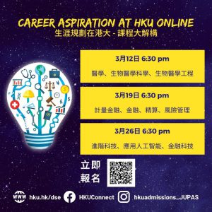 【#生涯規劃在港大】醫學、生物科學、生物工程到到底有何異同?精算、金融、計量金融及風險管理課程出路如何?進階科技範疇例如A.I.、金融科技,是否未來大趨勢? 香港大學將於 2021年3月12、19及26日(星期五)傍晚 6:30 – 7:30 舉行《生涯規劃在港大網上講座》,請來一眾港大畢業生、學生及老師,解構港大醫學、金融及進階科技三個範疇的課程特色,深入拆解課程的異同,以及將來不同的職業出路。學生大使亦會分享在港大讀書及生活的點滴。講座亦設問答環節,歡迎同學及家長屆時即場提問 講座語言:廣東話 講座形式:網上講座 歡迎中學生、家長及有興趣人士出席。請填妥以下表格完成報名: