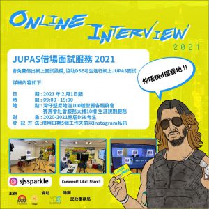 Career Sparkle 借場升學面試服務又來了! 為幫助同學可以有最好的面試環境及裝置進行Jupas面試,今年聖雅各福群會繼續提供免費借場服務! 面試當日會有機構同事在現場支援,完成面試後,亦會與同學傾談一下,讓同學下次表現得更好! 日期:2021年2月1日起 時間:09:00 – 19:00 地點:灣仔堅尼地道100號聖雅各福群會