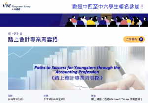 日期: 2021年2月9日 時間: 下午2時30分至5時 地點: 網上講座(透過Microsoft Teams 現場直播) 官方網頁: https://manpower-survey.vtc.edu.hk/tc/events/paths-to-success-for-youngsters-through-the-accounting-profession >>立即登記<<